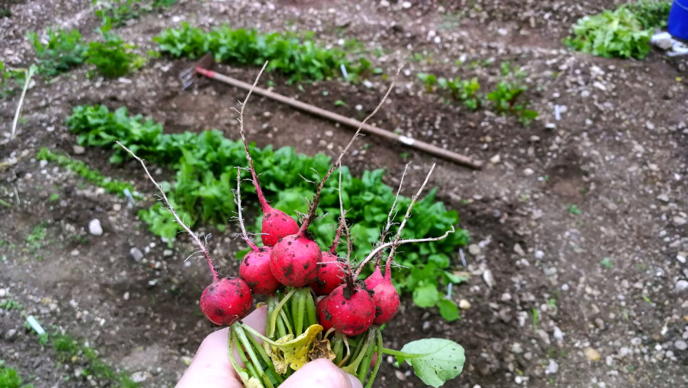 1,K Inhalt Anfang Mai: Mitgliederversammlung des Vereins Krautgarten Ramersdorf & JungpflanzenverkaufEinfache Rankhilfe bauen für Gurken und TomatenMitte Mai: Alles wächstEnde Mai: WachstumsschubErste Gerichte mit Zutaten aus dem Krautgarten: Puh, langsam sieht das Stück Feld tatsächlich mehr aus wie ein Garten. Hier mein Mai 2018 Monatsrückblick. Dies ist der zweite Artikel meiner Krautgarten-Reihe. Eine Übersicht aller Artikel, findet ihr hier. Im letzten Monat ist wahnsinnig viel auf dem Feld passiert und ich beobachte zum ersten Mal wirklich bewusst, wie Gemüse wächst. Wahrscheinlich bin ich die einzige Person auf diesem Feld, die jedes Mal mit dem Handy Fotos macht. Mittlerweile hat sich eine kleine Routine eingespielt: ich fahre fest am Sonntag auf’s Feld und dann noch 1 bis 2 Mal nach der Arbeit unter der Woche, abhängig vom Wetter. Ich habe im Mai auch ziemlich viele Youtube-Videos über den diverse Gemüse-Sorten geschaut und wozu man welchen Gartengerät benutzt. So viel neue Dinge zu lernen! Mitgliederversammlung Anfang Mai vom Krautgarten Anfang Mai: Mitgliederversammlung des Vereins Krautgarten Ramersdorf & Jungpflanzenverkauf Anfang Mai fand die Mitgliederversammlung des Krautgarten Vereins statt: Zum ersten Mal habe ich gesehen, wer noch alles am Start ist. Der Großteil scheinen tatsächlich Familien und Pärchen zu sein, einige Rentner sind auch dabei. Ende April gab es eine Rundmail mit Informationen zum Jungpflanzenverkauf, der im Rahmen der Mitgliederversammlung geplant war. Ich konnte aus einer Excel-Tabelle verschiedene Gemüse-Jungpflanzen bestellen. Ich habe für ca. 40€ Jungpflanzen ausgesucht und die Bestellung wurde am Tag der Versammlung bereits in fertig sortierten Kisten angeliefert. Unterstützung gab’s von Chrissi, die den Vormittag fleißig am Start war. Wenn ich im Sommer in Japan bin, darf sie nämlich auf’s Feld aufpassen. (Danke!) Wir haben die Pflanzen alle auf dem Feld verteilt und sind dann erst einmal zum Bäcker und frühstücken, weil wir auf die zweite Pflanzenlieferung gewartet haben, haben diese eingepfalnztund dann sind wir wieder heim. Eigentlich wollte ich alle Pflänzchen angießen, aber es war unmöglich Gießkannen zu bekommen, wenn alle Vereinsmitglieder auf dem Feld aktiv sind. Naja, also heim und am Abend noch einmal hin. Mittlerweile sind auch mehr Gießkannen vorhanden, weil dies auf der Mitgliederversammlung gefordert wurde. Dadurch, dass man immer erst zum Bach mit einem Bollerwagen muss, nimmt sich halt jede Partei immer direkt 5 Gießkannen, damit es sich lohnt. Zum Vergleich: für meine 30qm brauch ich tatsächlich 8-10 volle Gießkannen, um alles ausreichend zu wässern. Hier die Liste an Gemüse, dass ich bestellt habe: 3x Spitzkohl, 4x Brokkoli, 6x Kohlrabi blau, 6x Kohlrabi weiß, je 3x Kopfsalat, Romana und Lollo Rosso, 2x Knoblauch, 1x Aubergine, 2x Tomatenpaprika, 1x Minipaprika, 2x Kastengurken, 2x Schlangengurken,2x Cocktailtomaten, 2x Mini-Wassermelone, 2x Knoblauch, 4 verschiedene Sorten Zucchinis, 2x Süßkartoffen und dann gab es noch ein paar Pflanzkartoffeln. Einfache Rankhilfe bauen für Gurken und Tomaten Natürlich habe ich danach erst ein bisschen weitergelesen, welche Anforderungen die Gemüsesorten haben und habe gelernt, dass Gurken und und Tomaten ein bisschen Unterstützung für die Haltung brauchen. Also habe ich bei nächster Gelegenheit im Baumarkt vorbeigeschaut und ein bisschen Material eingekauft. Eigentlich wollte ich eine fertige Rankhilfe kaufen, aber die waren alle so überdimensional, dass ich die mit dem Radl nie wegbekommen hätte. Also habe ich einfach ein paar Rundstäbe gekauft und nach Vorbild eines Pinterest-Bildes folgende Rankhilfe gebastelt: Ich finde tatsächlich, dass sie ziemlich cool ausschaut. Ein Hoch auf Rundhölzer, Kabelbinder und ein bisschen Paketband. Mitte Mai: Alles wächst Leider war Mitte Mai ziemlich regnerisch bei uns in München und zwar nicht nur einfach Regen, sondern richtig fette Unwetter. Teilweise hatte ich Angst, dass mir der Regen wahlweise die Pflanzen aus der Erde spült, diese mir wegschimmeln oder der Regen alles platt drückt. Aber an sich ging es aber ganz okay aus: Krautgarten am 13. Mai 2018 Krautgarten am 22. Mai 2018 Am 22. Mai habe ich auch den Rettich ausgedünnt. Tatsächlich kam mehr raus aus den Samen und damit sich die Pflanzen richtig ausbilden können, musste hier ein paar Pflanzchen weichen. Auch bei den Radieschen musste ich etwas ausdünnen, damit sie sich nicht gegenseitig den Platz wegnehmen. Lustige Anekdote: Spaziergänger im Ostpark bleiben relativ häufig am Feld stehen und fragen, was das für ein Projekt ist. Da mein Feld direkt am Weg liegt, komme ich öfter ins Vergnügen mit Leuten zu reden. Und einmal kam genau zu uns ein Hund, kackte neben und dann kam auch schon die Besitzerin zu uns, die die das Häufchen eingesammelt hat und dann rumpöbelte: „10 Jahre lang war das hier die Toilette von meinem Hund und jetzt habt ihr uns das einfach weggenommen und scheiß Gärten hingesetzt!“ und dann verschwand sie wieder. Sie musste sich wohl einfach mal Luft machen. Ende Mai: Wachstumsschub Wow, ich bin begeistert – langsam wird alles mehr und größer und es bilden sich erste kleine Blüten an den Zucchinis und Gurken. Ich konnte mittlerweile sogar die ersten Sachen ernten. Leider musste ich eine der beiden Knoblauchpflanzen rausziehen: Der Regen hat das Grün vom Knoblauch so hart beschädigt, dass alles abgeknickt war und alles nur an wenigen Teilen hielt. Jetzt trocknet der Mini-Knoblauch im Keller. Auch eine meiner vier Brokkoli-Pflanzen ist weg: Sie fiel wohl einem Vogel zum Opfer, der einfach Bock auf Brokkoli hatte. Denke ich werde demnächst mal ein bisschen rumschauen, was Vögel vom Feld abhält. Eine ganze Vogelscheuche werde ich sicher nicht aufstellen können. Krautgarten am 27. Mai 2018 So, das war der Mai im Krautgarten. Ich bin gespannt, was der Juni bringt. Aktuelle Updates könnt ihr bei mir