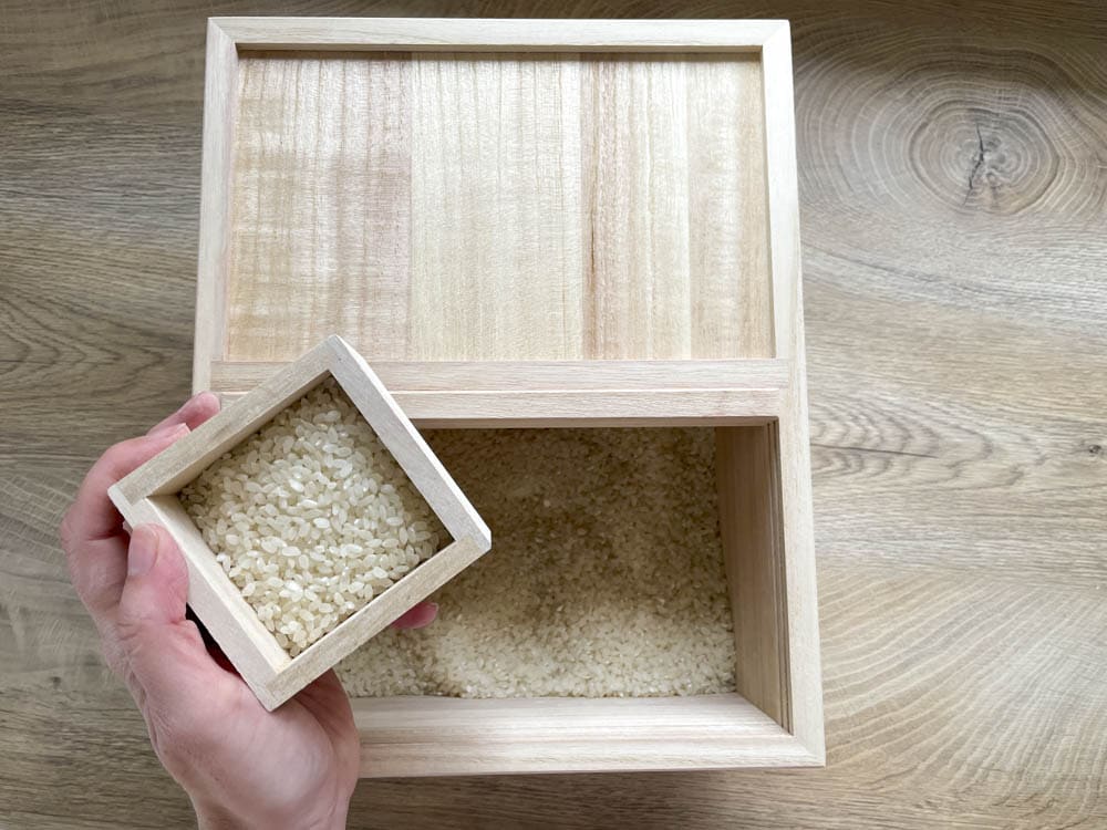 13,3K Inhalt Rundkornreis ist der japanische Reis der WahlTipps zur Zubereitung von japanischen ReisSushi-Reis kochen: Vorher waschen nicht vergessen!Reis einweichen lassen: OptionalJapanischer Reis wird ohne Salz gekochtSushi Reis kochen: im ReiskocherSushi Reis kochen: im KochtopfSushi Reis kochenFinger weg von Basmati- und Jasminreis: Passende AlternativenReis auf Vorrat kaufenJapanische Rezeptideen mit Reis Egal ob für Sushi oder andere japanischen Gerichte: Reis ist DAS Grundnahrungsmittel in Japan und wird für viele Rezepte der japanischen Küche verwendet. Da mir in letzter Zeit immer wieder viele Fragen rund um das Thema „Sushi-Reis kochen“ gestellt wurden, habe ich mir gedacht, dass ein kleiner Info-Artikel für viele hilfreich ist. Ich hoffe, ich kann hier die meisten Fragen beantworten. Falls noch etwas offen bleibt, dann schreibt doch einfach einen Kommentar und ich nehme es noch mit auf. Direkt zum Rezept Dieser Artikel dreht sich um die Zubereitung von japanischen Rundkornreis und wie dieser dann für Sushi weiterverwendet wird. Rundkornreis ist der japanische Reis der Wahl Der am häufigsten verwendete Reis in der japanischen Küche ist „uruchi mai“ (粳米). Ein Rundkornreis, der etwas zusammenklebt und hat eine leichte cremige Textur hat. Es ist die simpelste Form von gekochten weißen Reis. Dieser Reis ist in der japanischen Küche der Standard: Es gibt ihn als Beilage, als Onigiri oder er wird für Sushi weiterverarbeitet. Auch zu japanischem Curry-Reis wird er gereicht. So sieht japanischer Rundkornreis ungekocht aus. Wegen der leicht klebrigen Konsistenz, wird hierzulande auch gerne mal „Klebreis“ als Bezeichnung genutzt. Dies ist aber nicht korrekt, da Klebreis eine andere Reisart ist, die deutlich mehr Stärke enthält. Klebreis ist Mochigome (もち米) und aus ihm werden z. B. japanische Reiskuchen (Mochi) gemacht. Kleine Wortspielerei: Das japanische Wort für gekochten Reis „gohan“ (ご飯) ist gleichzeitig das Wort für „Mahlzeit“ – so tief verankert ist Reis also in der japanischen Küche. Eine Mahlzeit ohne gekochten Reis ist kaum vollständig. Auch im Deutschen kennt man ja das „Abendbrot“ oder die „Brotzeit“. Ein traditionelles Maß in Japan: eine kleine Masu-Box aus Holz mit Reis. In dieser Box bewahren wir unseren 5 kg Vorrat an Reis auf. Der Deckel lässt sich aufschieben. Tipps zur Zubereitung von japanischen Reis Hier noch ein paar Themen, die mir regelmäßig in Gesprächen immer wieder unterkommen. 🙂 Sushi-Reis kochen: Vorher waschen nicht vergessen! In der japanischen Küche wird Reis grundsätzlich vor dem Kochen gewaschen. Dies wird gemacht, um überschüssige Stärke und auch eventuelle Verunreinigungen zu entfernen. Vorteile von gewaschenem Reis sind: Der Reis ist lockerer: Weniger Stärke bedeutet, dass der Reis weniger zusammenklebt. Zwar soll der japanische Reis etwas aneinanderkleben, aber nicht matschig sein. Der Reis kann besser seinen Geschmack entfalten. Der Kochvorgang wird ruhiger: Bei zu viel Stärke blubbert gerne mal der Topfdeckel hoch. Der Reis nach dem Waschen. Zum Waschen füllt ihr den Reis in einen Topf und gebt kaltes Wasser hinzu. Bewegt die Hände mit kreisenden Bewegungen durch den Reis. Das Wascher wird durch die Stärke trüb, dieses kannst du abgießen. Den Prozess 2-4 Mal wiederholen, bis das Wasser fast klar ist. Reis einweichen lassen: Optional Es wird auch empfohlen, den Reis etwa 30 Minuten im Wasser ziehen zu lassen und das Wasser vor dem Kochen wegzuschütten. Angeblich lässt sich damit auch die Garzeit verkürzen, aber dies habe ich noch nicht wirklich bemerkt. Dies wird vor allem gemacht, um Arsen im Reis zu lösen. Wildreis ist dafür aber anfälliger als der weiße japanische Reis. Japanischer Reis wird ohne Salz gekocht Außer Wasser und Reis kommt standardmäßig nichts weiter in den Topf dazu. Auch kein Salz! Die japanische Küche ist ziemlich salzig, durch den Einsatz von Sojasoße, Misopaste und Dashi. Der neutrale Reis ist da ein willkommener Ausgleich, auch wenn dies auf den ersten Bisschen so manchem etwas fad vor kommen mag. Mit der Zeit lernt man aber den Geschmack von weißem Reis zu schätzen. Es lohnt sich also, sich darauf einzulassen. Wem etwas fehlt, der kann auch zur Furikake* greifen. Dies ist Reisgewürz in verschiedenen Geschmacksrichtungen. Darüber hinaus gibt es aber auch Rezepte, die sich unter dem Begriff Takigomi Gohan („Gemischter Reis“) zusammenfassen lassen: Ähnlich wie bei einem One Pot-Gerichten kommen verschiedene Zutaten in den Reis zum Kochen. Reis mit Sojasoße, Dashi und Lotuswurzel gekocht. Sushi Reis kochen: im Reiskocher Immer wieder kommt die Frage, ob man denn wirklich einen Reiskocher braucht und immer wieder kommt es zu Diskussionen. Eine viel zu emptional geführte Diskussion, wenn du mich fragst. Ich persönlich mag auf unseren Reiskocher nicht verzichten, da er mein Leben leichter macht. Auch die Zubereitung damit ist sehr einfach: Im Inneren gibt es eine Markierung, die einem sagt, wie viel Wasser pro Cup Reis hinzugegeben werden muss. Die Kochzeit dauert etwa 30 Minuten. Lange Zeit haben wir einen kleinen Discounter-Reiskocher gehabt, der mittlerweile an eine Freundin verschenkt wurde, die damit immer noch fleißig Reis kocht. Wir haben uns bei einem Japanurlaub einen Reiskocher in Japan gekauft und mit nach Deutschland gebracht. Immer noch fleißig im Einsatz: Hitachi-Reiskocher aus Japan. In allen größeren Elektromärkten Japans gibt es Abteilungen für Ausländer und hier bekommt ihr Elektrogeräte mit deutschen Steckern und für die Spannung unseres Stromnetzes geeignet. Gekostet hat uns der Reiskocher um 150 Euro, aber es hat sich definitiv gelohnt! Mittlerweile ist der Reiskocher auch schon seit 2014 im Einsatz. Sushi Reis kochen: im Kochtopf Selbstverständlich kann man japanischen Sushi-Reis auch im Topf kochen. Nehme einen größeren Topf, da der Reis einiges an Volumen zunimmt. Es gibt in Japan dafür auch ex